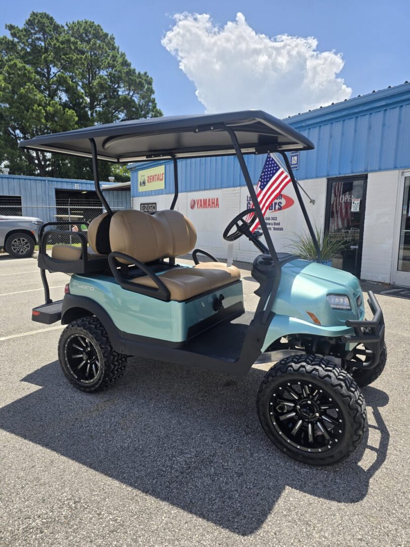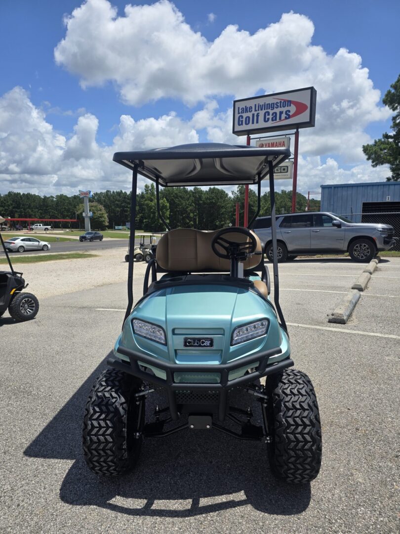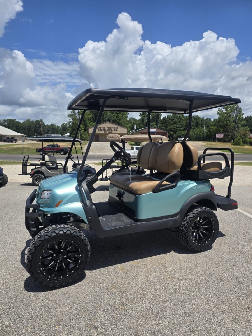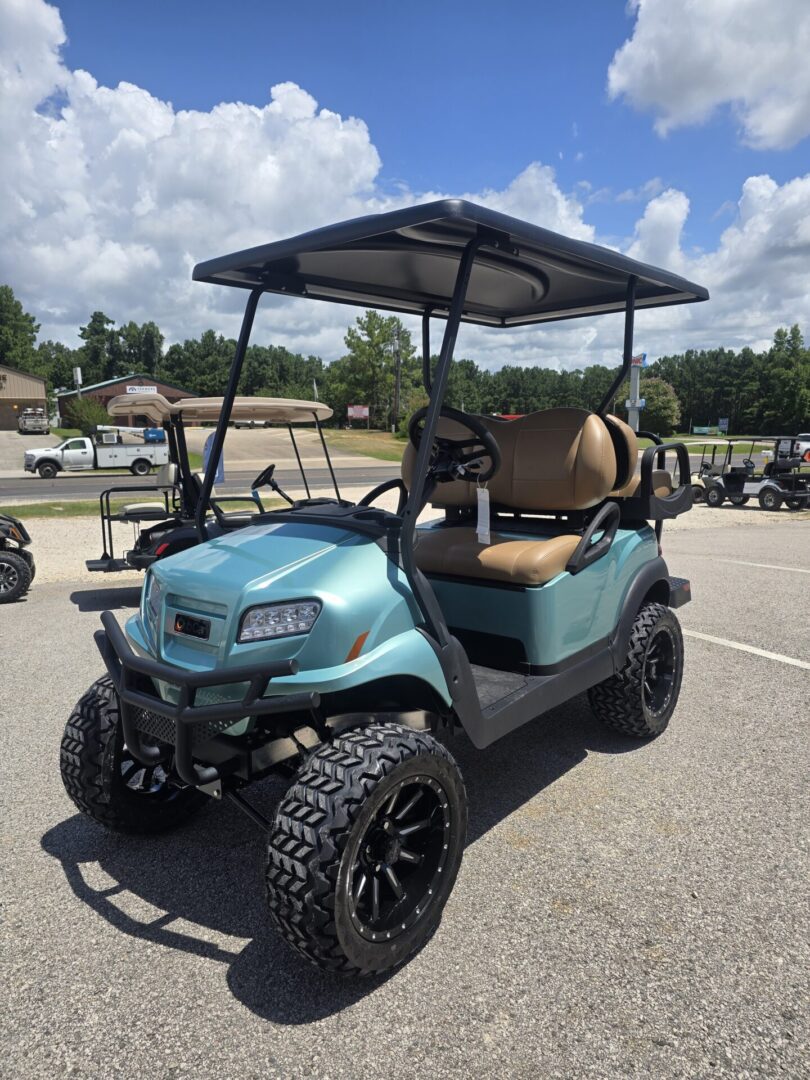 Seafoam Green. Carmelo seats. Black extended top. Rear flip seat. Brush Guard. Cooler insert ( OPTIONAL UPGRADE) Head lights, tail lights and turn signals. Horn. 3 inch lift. 23×10-14 Kenda Kraken tires on black Club Car wheels. Newly designed dash with locking glovebox, 4 cup holders, Fuel gauge, hour meter, engine and oil light, and USB ports. Under dash storage. 14HP Kohler gas engine with electronic fuel injection. Approx. 250 miles per tank of unleaded gasoline. 2 year manufacturer warranty.