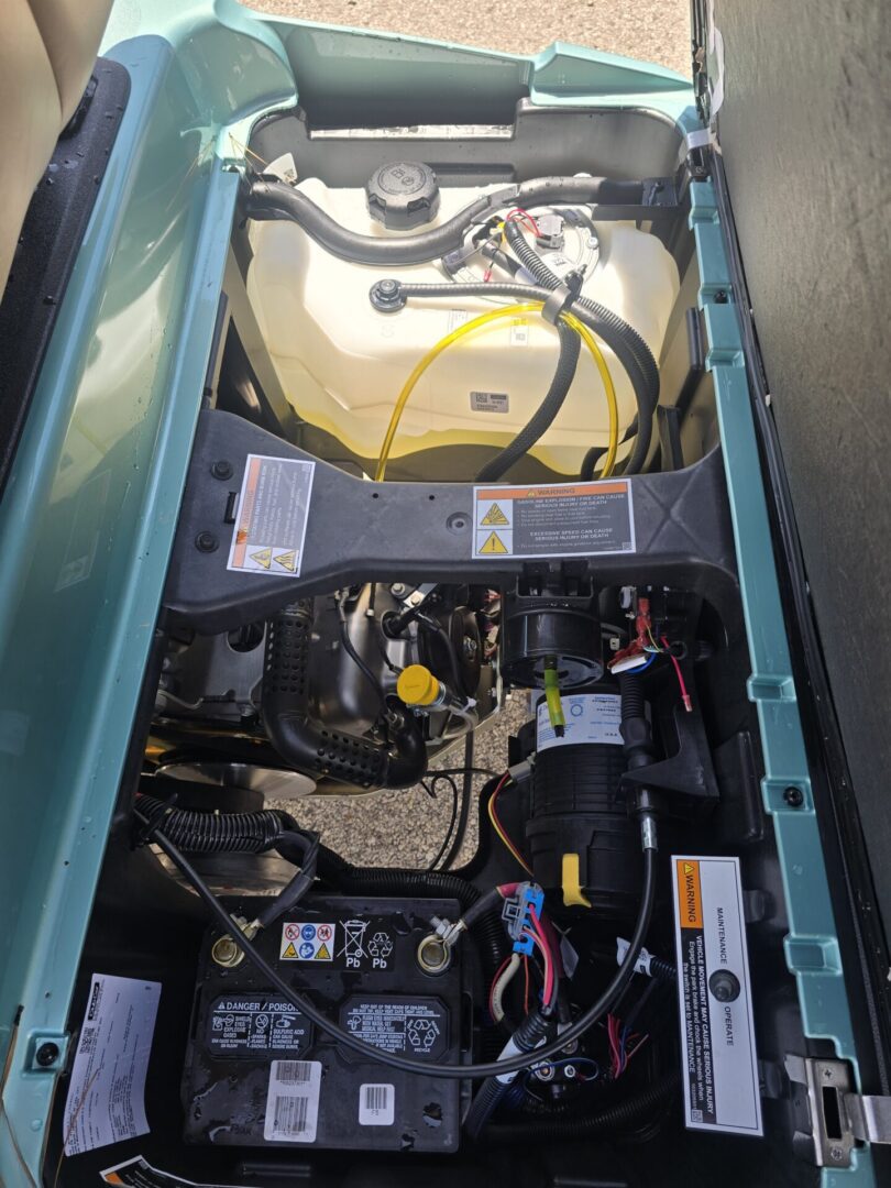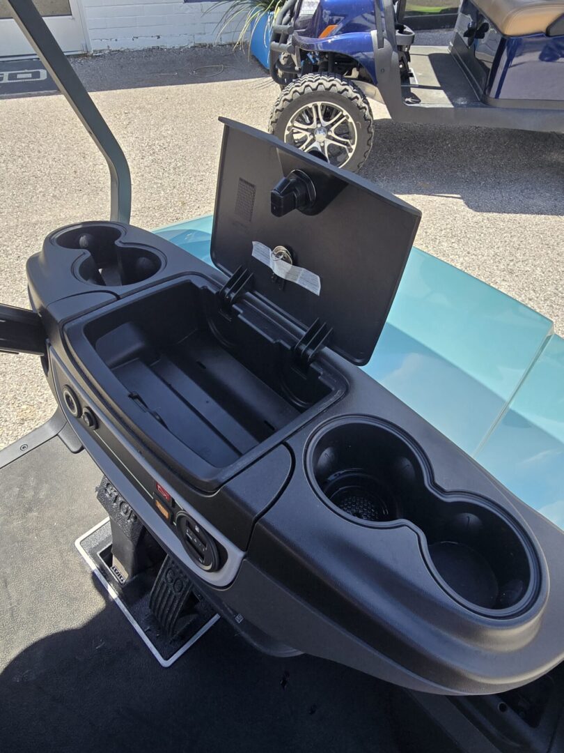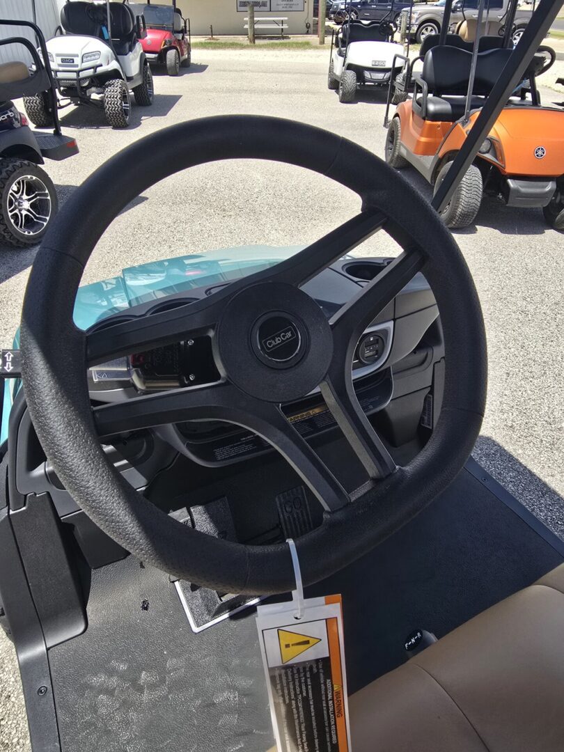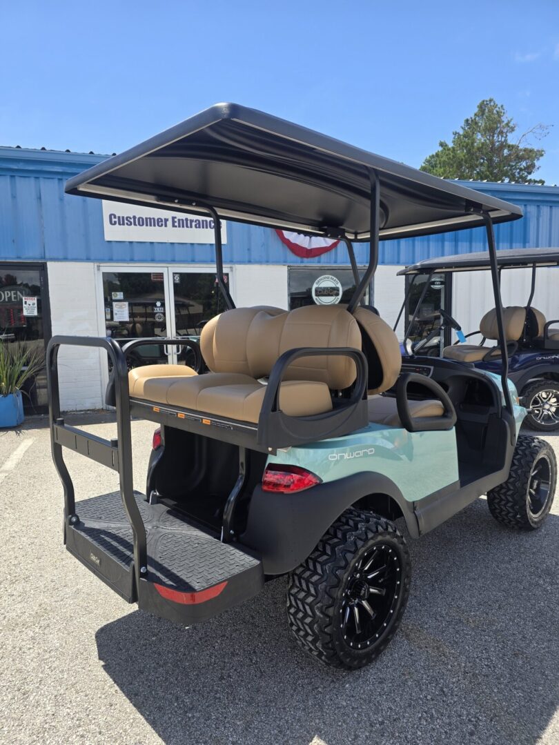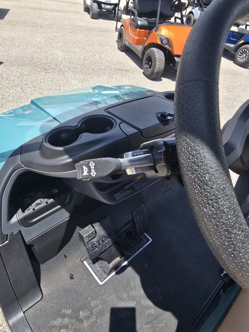 Seafoam Green. Carmelo seats. Black extended top. Rear flip seat. Brush Guard. Cooler insert ( OPTIONAL UPGRADE) Head lights, tail lights and turn signals. Horn. 3 inch lift. 23×10-14 Kenda Kraken tires on black Club Car wheels. Newly designed dash with locking glovebox, 4 cup holders, Fuel gauge, hour meter, engine and oil light, and USB ports. Under dash storage. 14HP Kohler gas engine with electronic fuel injection. Approx. 250 miles per tank of unleaded gasoline. 2 year manufacturer warranty.